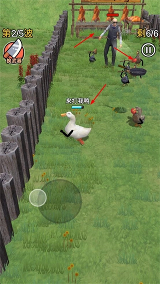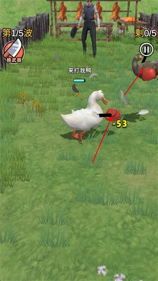 在草地上和敌方鸭子展开战斗,借助攻击削减它们的血量,把敌人全部消灭,达成每一轮战斗的目标。