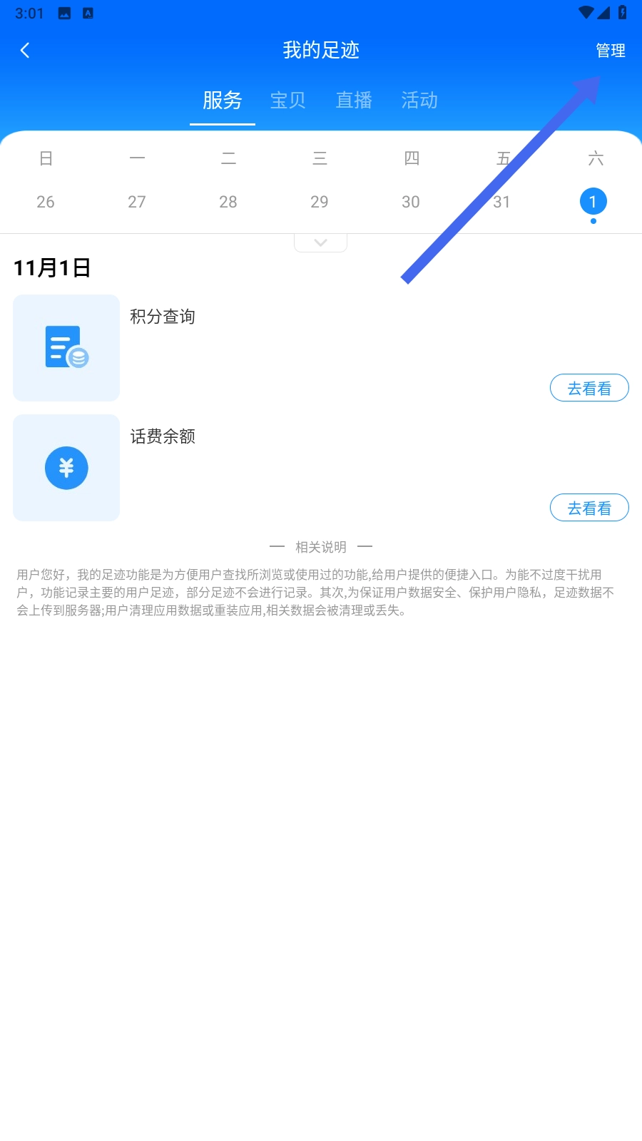 进入我的足迹页面后,点击右上角的【管理】按钮,就能进入足迹管理模式啦。