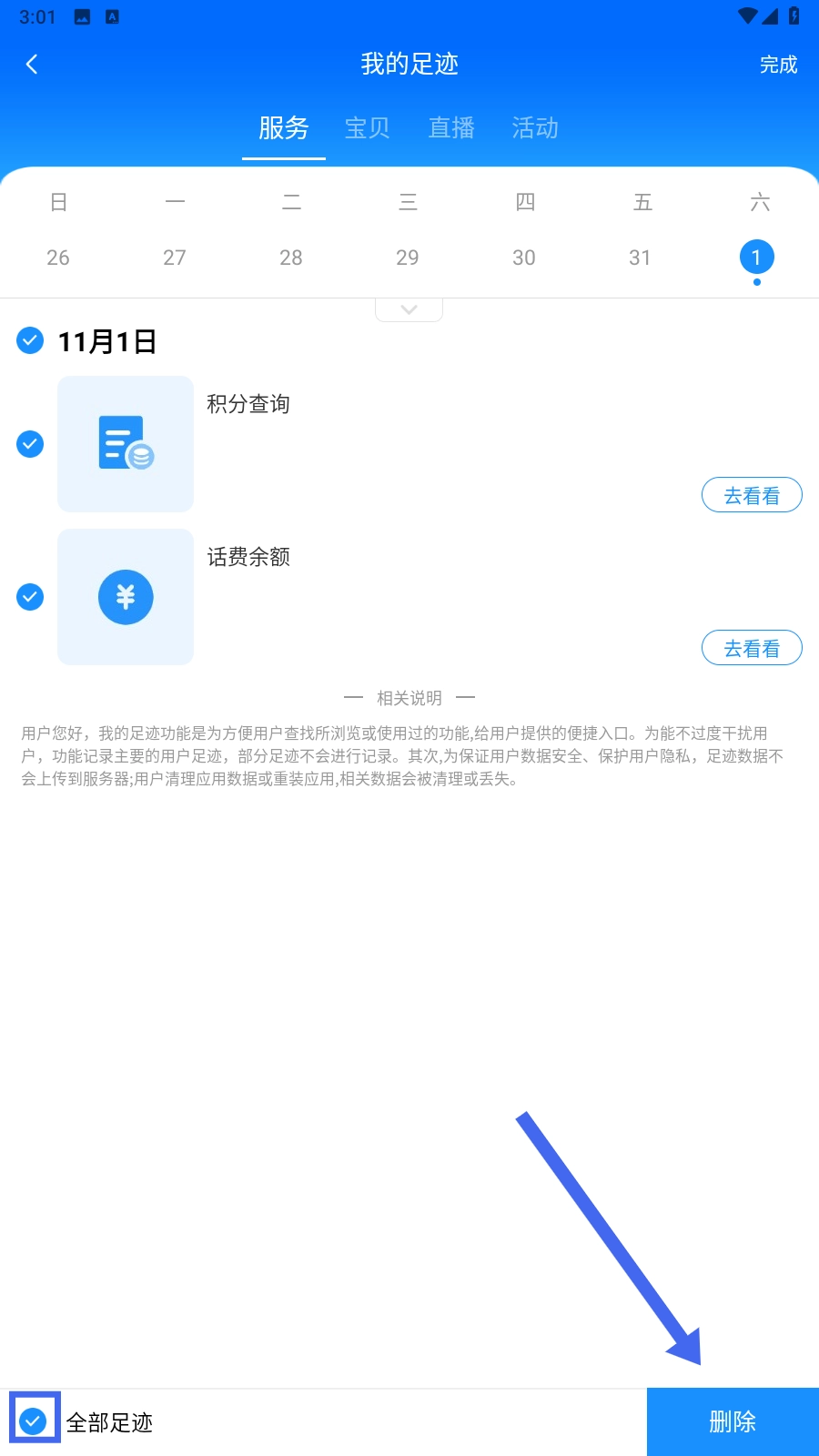 勾选【全部足迹】后,点击【删除】按钮,就能把足迹记录全部清空了。