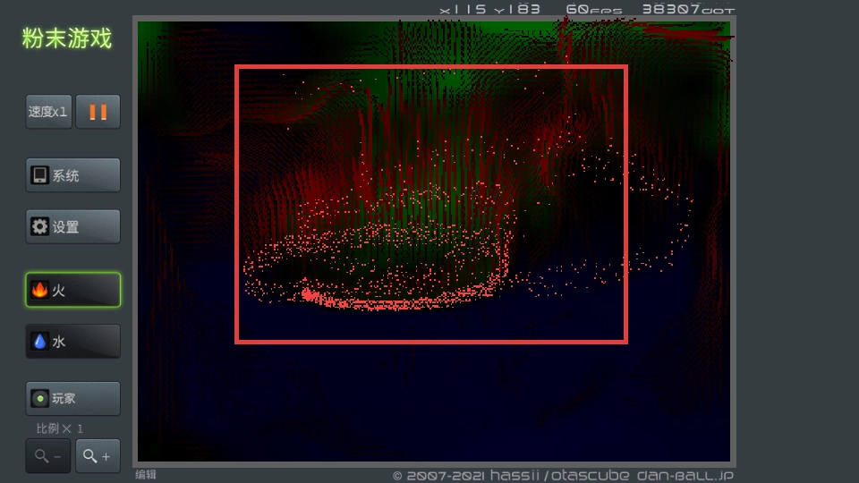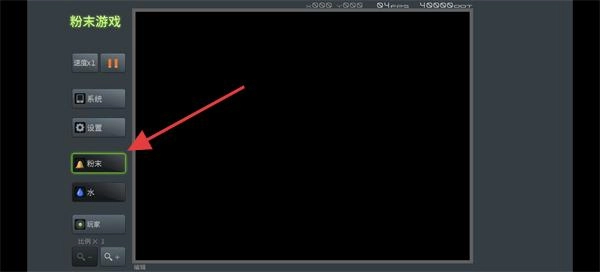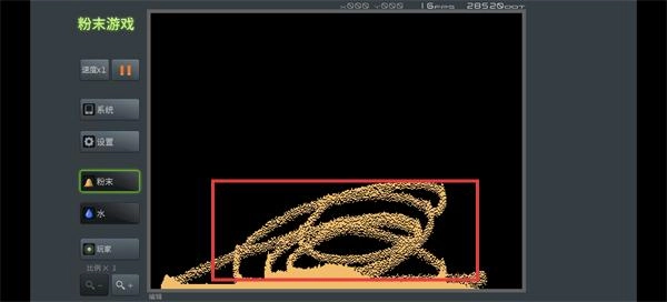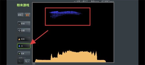 点击左边的【水】按钮来选中这个元素,接着在场景里添加水,留意水和粉末之类元素之间的互动情况。
