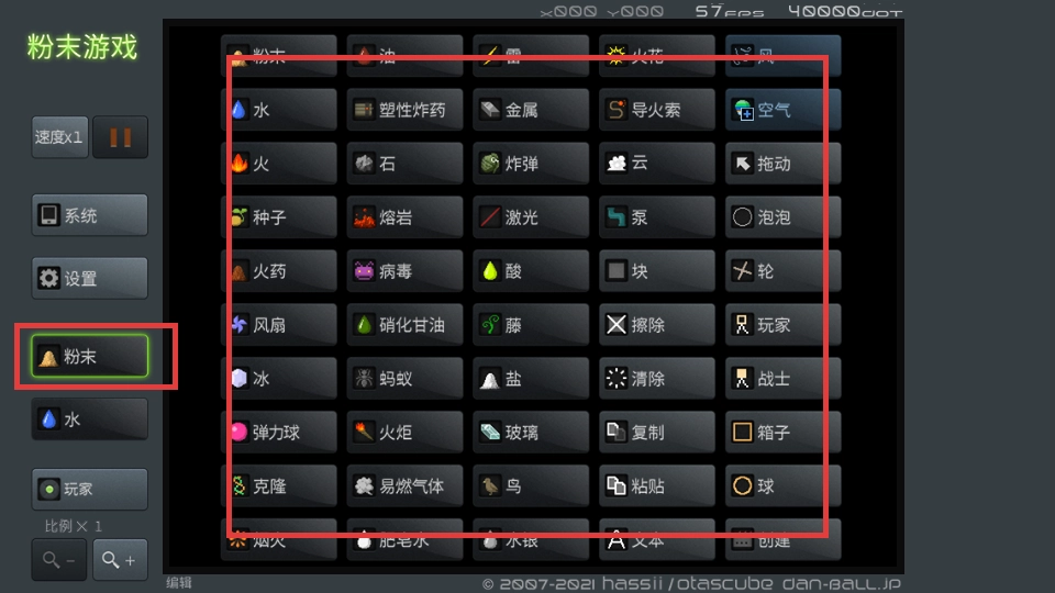 在编辑模式下,点击左侧的【粉末】按钮,选中该元素,即可在场景中添加粉末类物质。