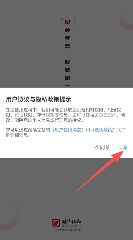 首次打开应用时,在弹出的用户协议和隐私政策提示界面点击“同意”按钮。
