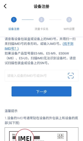 进入“设备注册”页面,在输入框中填写设备的IMEI号或SN号,也可使用扫一扫功能扫描设备上的IMEI号完成输入。