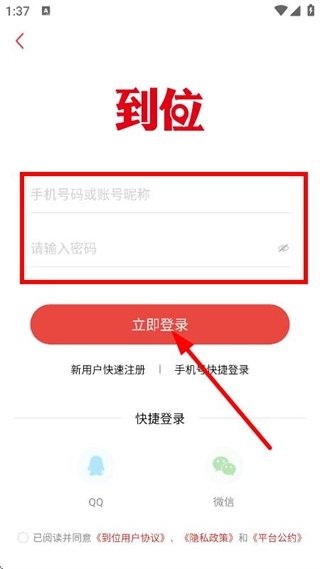 输入手机号码或账号昵称、密码,点击登录,完成账号登录操作。