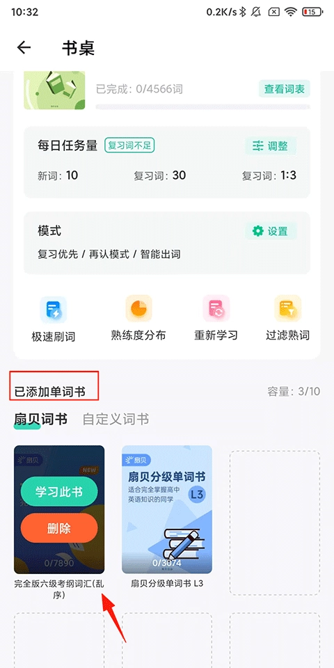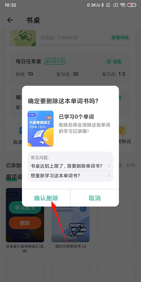 在打开的书桌页面里,长按下方已添加且需要删除的单词书,然后点击【删除】按钮。