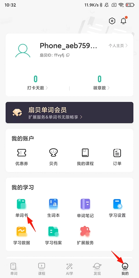 打开扇贝单词英语版,点击【我的】-【单词书】;