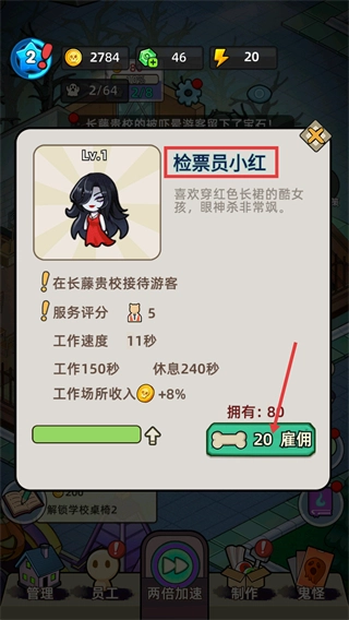 雇佣【检票员小红-Lv.1】,需消耗【20-骨头】,她能使工作场所收入提升【+8%】,为长藤贵校的游客接待任务推进提供助力。