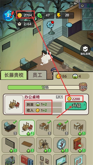 消耗【2200-金币】升级【办公桌椅-LV.1】,可提升【刺激-1+2】与【收入-1+2】,增强场所的收益能力。