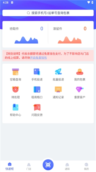 在快递柜的操作界面上,我们可以看到空箱查询、手机投递、批量投递、我的包裹等多个功能板块。