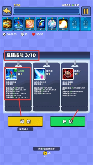 在【选择技能-3/10】环节,能挑选【三叉戟】这类范围持续伤害的技能,选定后点击【开始】按钮来推进关卡流程。