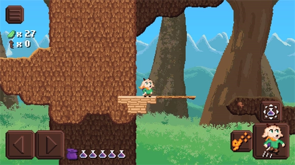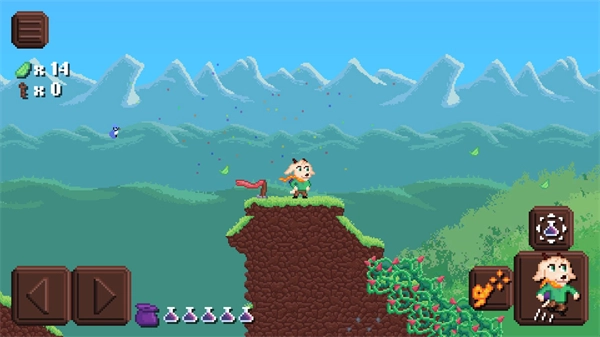 游戏界面左侧的控制区域用于操控角色前进,右侧则设有跳跃、使用绳索以及投掷药瓶的功能按钮。
