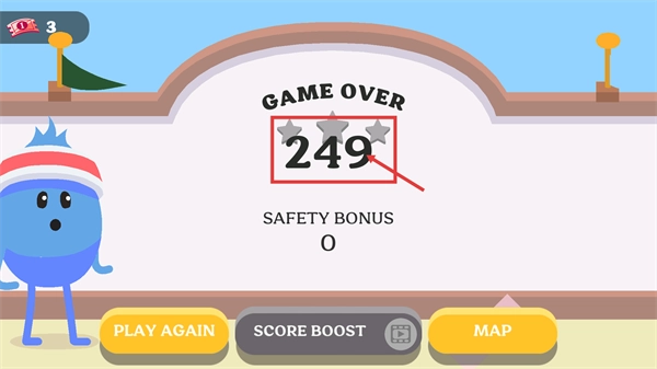 关卡失败后会显示【249】的得分,点击【PLAY-AGAIN】按钮就能重新挑战该关卡,你可以借此机会努力提升得分和通关表现。