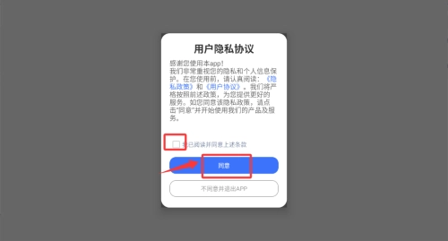 在用户协议和隐私政策的弹窗里,把同意选项勾选上,再点击确认按钮。