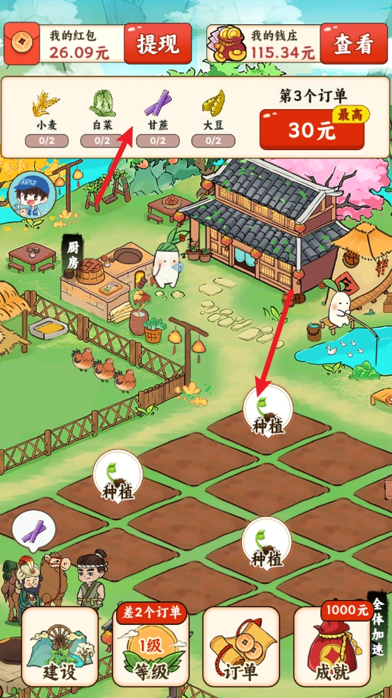 在游戏里,玩家能查看顶部的订单详情,接着点击空着的地块种植相应的作物。