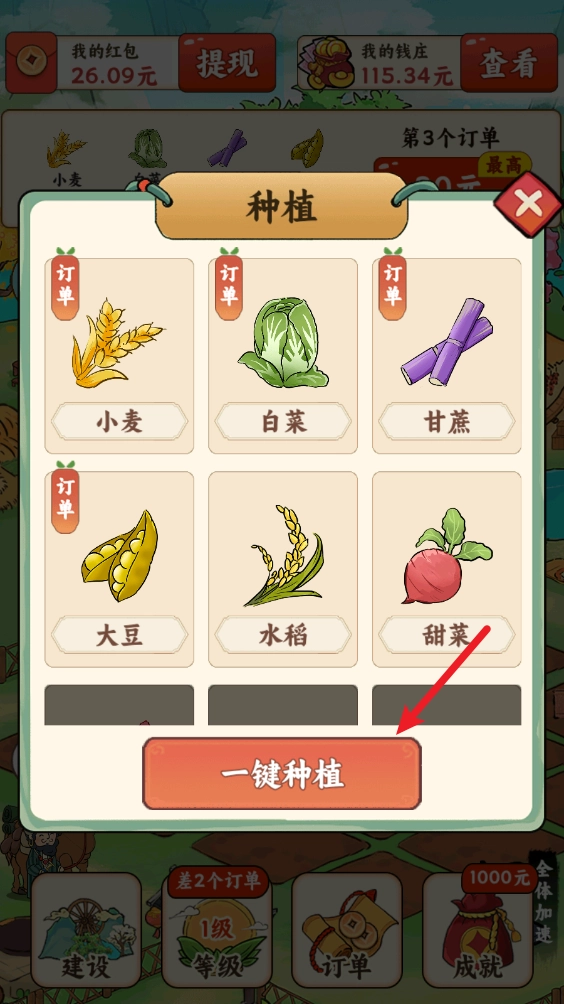 在种植界面会清晰标注出订单要求的作物,点击对应作物就能进行种植,此外还可以选择一键完成所有种植操作。