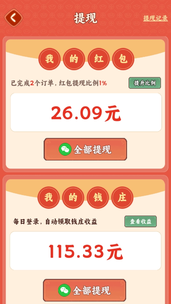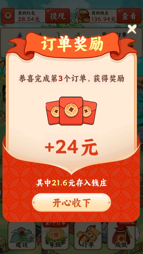 真的能兑换!游戏里的红包得靠完成订单或者看广告获取,前期完成大概4个订单,红包就能攒到30,再按百分之一的比例兑换,就能达到0.3的最低提现门槛,小编亲测秒到账哦!
