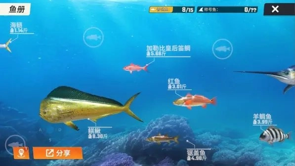 鱼类相册查看已经获得的鱼类。