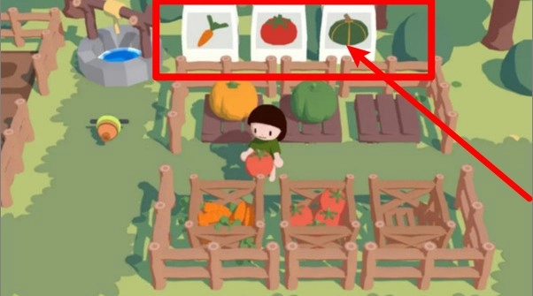 作物选择界面:轻点屏幕顶部的图标,就能挑选要种植的作物种类,比如胡萝卜、西红柿和南瓜,操作便捷,可轻松打理田地。