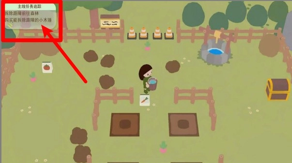 任务目标提示:左上角显示当前主线任务内容,引导玩家逐步完成目标,如浇水、伐木等,帮助掌握游戏节奏与玩法流程。