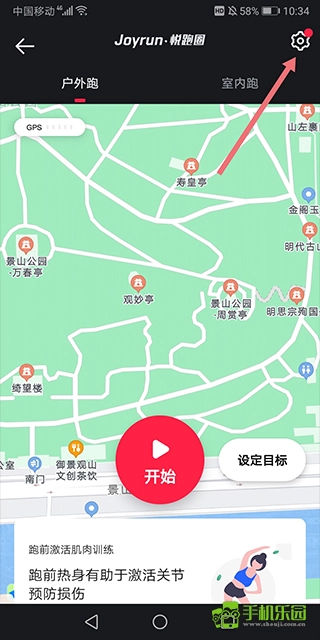 进入跑步记录页面后,还能点击右上角的【设置】图标(即下图中红色箭头所指向的区域)