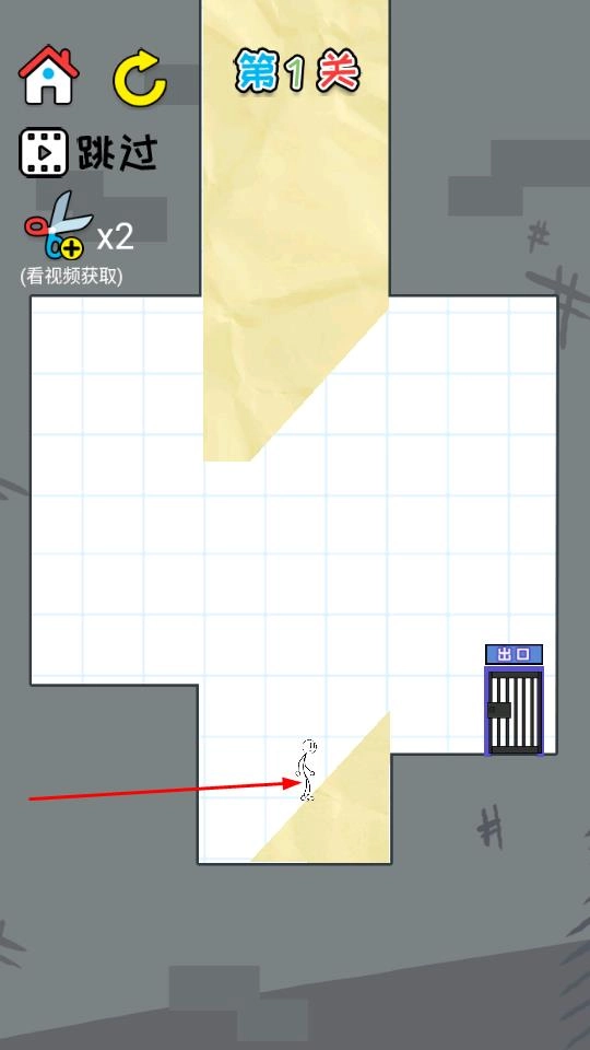 点击启动页上的黄色“开始游戏”按钮,即可进入第1关。该关卡界面左侧设有主页、重置、跳过(需看视频解锁)按钮,此外还有剪刀道具(限用2次,可通过观看视频获取)。