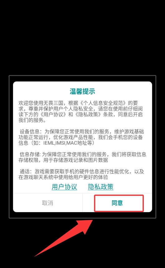 点击红色框框的同意进入游戏。