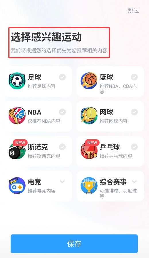 首页支持根据个人兴趣选择足球、NBA等不同运动类型,系统会优先推送对应的赛事内容。