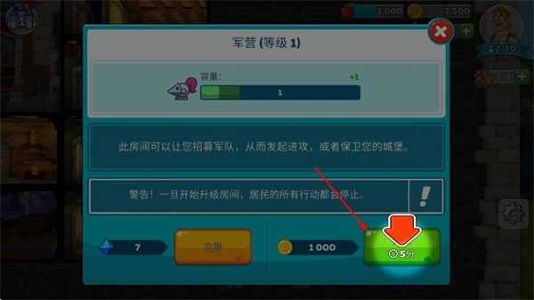 可以花费金币对军营进行升级,升级完成后就能招募更多的军队,这些军队既可以用来发起进攻,也能用于保卫城堡,但需要注意的是,在军营升级的过程中,居民的行动会暂时停止。