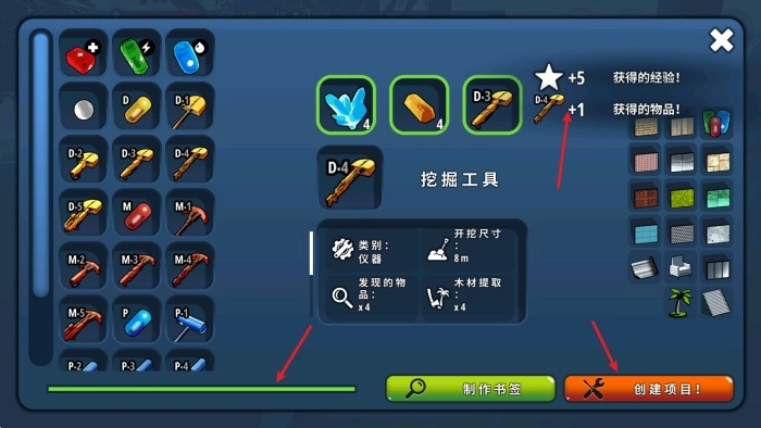 点击右下角的“创建项目”按钮后,系统会消耗相应材料启动制作流程;当左下角的进度条加载完成,即可获取成品物品并同步获得经验值。