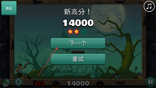 清除关卡内的全部僵尸,在收到新高分的提示后,点击“下一个”按钮进入下一关。
