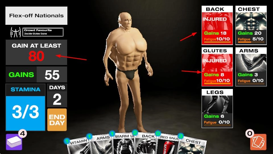 阿诺模拟器是一款移植自Steam平台的幽默卡牌模拟游戏,玩家将化身健身达人,通过卡牌策略对背部、腿部、腹部和胳膊等身体部位展开强化训练,在限定时间内完成体型进化,最终在健身赛事中战胜对手赢得冠军。游戏整体画风诙谐有趣,为玩家带来轻松且富有策略性的游戏体验。