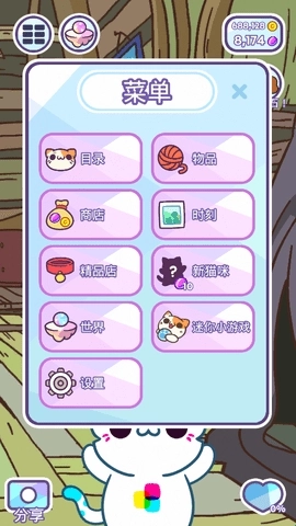 所有功能都包含在菜单之中,像猫咪、物品、商店、时刻、迷你小游戏这类内容都在里面。