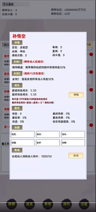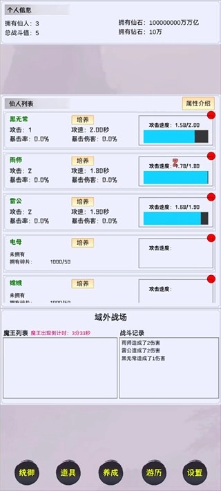 玩家还能看到仙人列表,其中包含黑无常、雨师、雷公、电母等众多仙人,等待着玩家去培养。每个仙人都具备独特的攻击、攻速、暴击率、暴击伤害等属性。