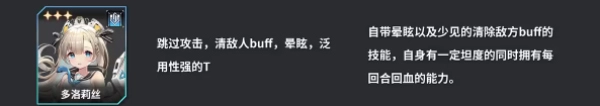 多洛莉丝:可跳过攻击、清除敌人增益效果并造成晕眩,是泛用性很强的坦克角色。