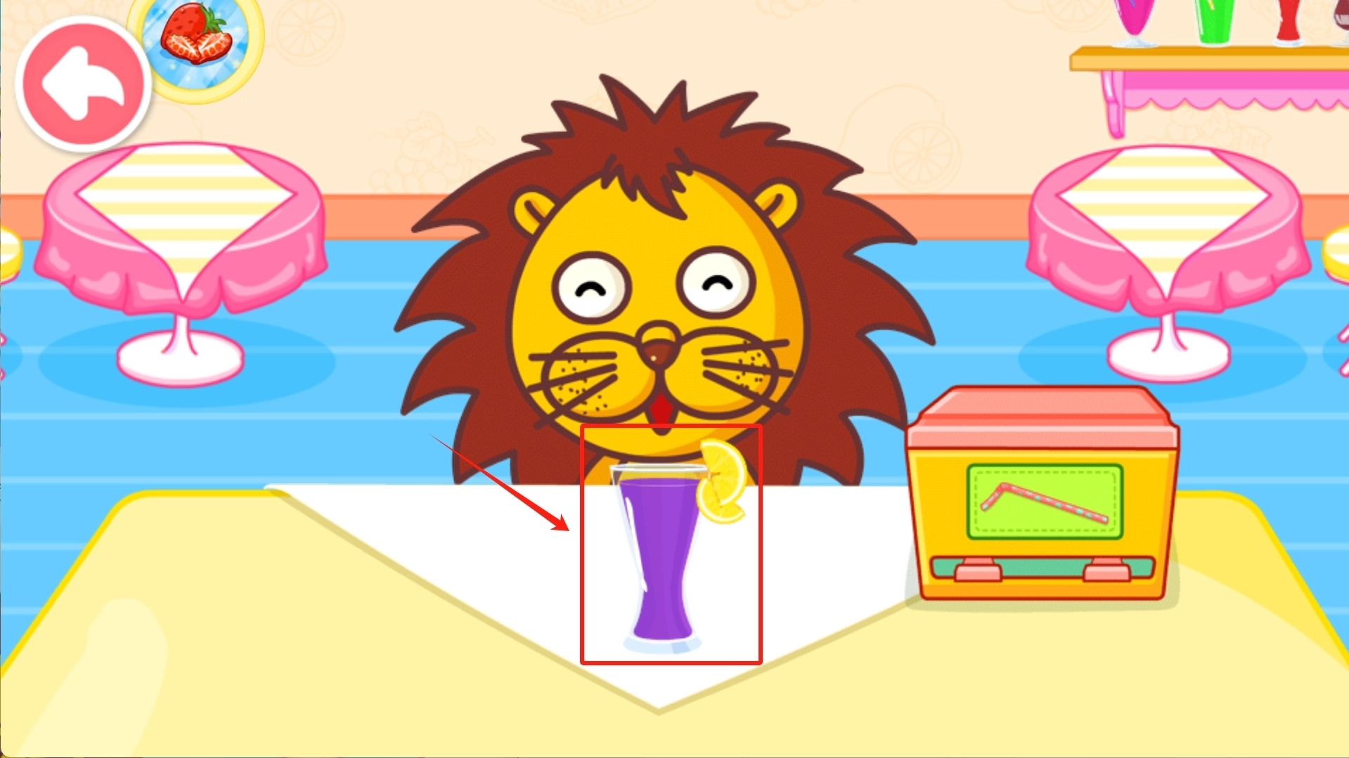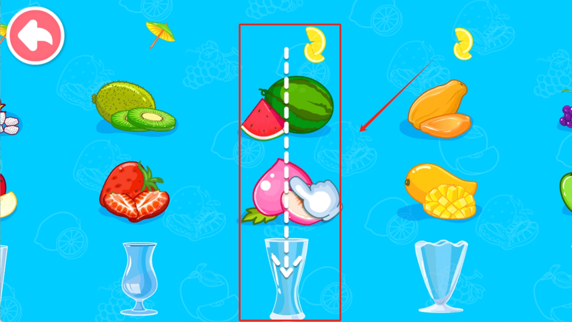 以果汁小店为例,顾客进店后,我们需要为其制作果汁,只需按照箭头指示的方向滑动操作,就能完成一杯果汁的制作。