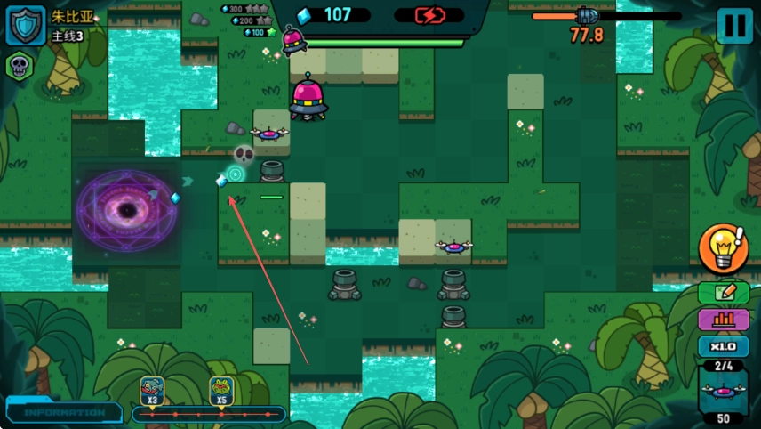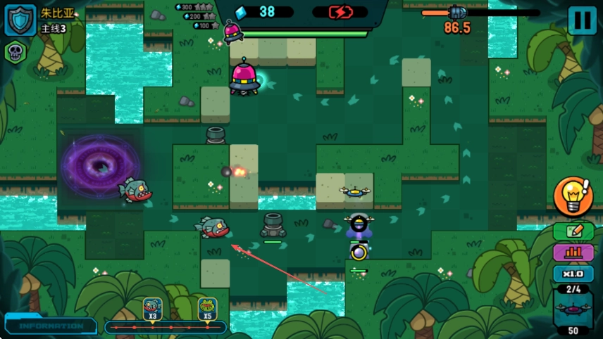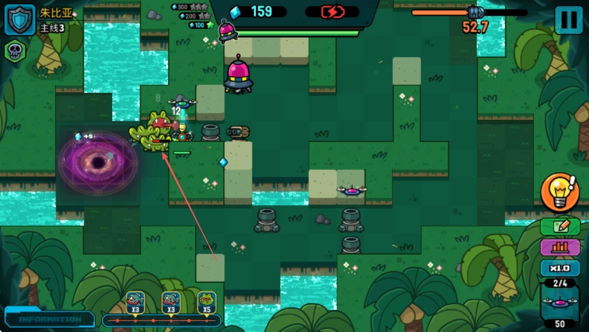随着游戏进程推进,留意左上角朱比亚主线3的标识,及时对炮塔进行升级,提升火力来应对更多敌人。