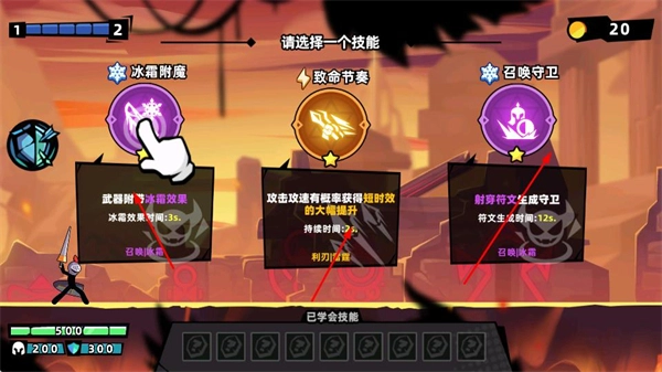 战斗进行时会出现技能选择的机会,你可以从冰霜附魔、致命节奏、召唤守卫这类技能里进行挑选,每种技能都有其独特的效果,能够为战斗提供帮助。