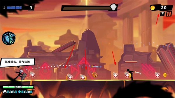 在关卡里,要把握好时机施展格挡之类的操作,另外还要收集场景中的道具、金币这类资源,以此来增强自身能力或者获得收益。