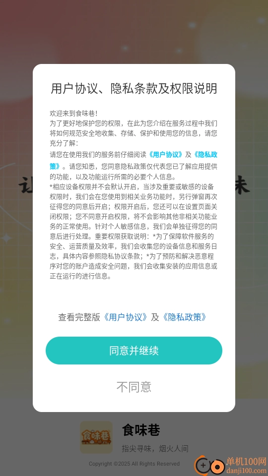 打开软件后,仔细阅读“用户协议、隐私条款及权限说明”,随后点击“同意并继续”按钮即可进入。