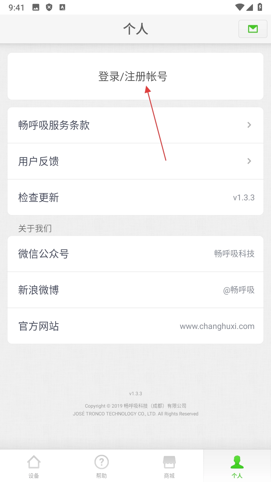 在个人页面,点击【登录/注册帐号】按钮,即可进入账号登录注册页面。