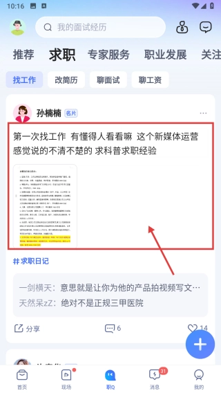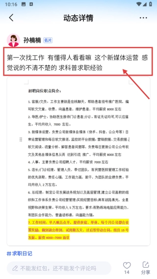 在动态详情页中,浏览该动态的具体内容,获取求职经验相关信息。