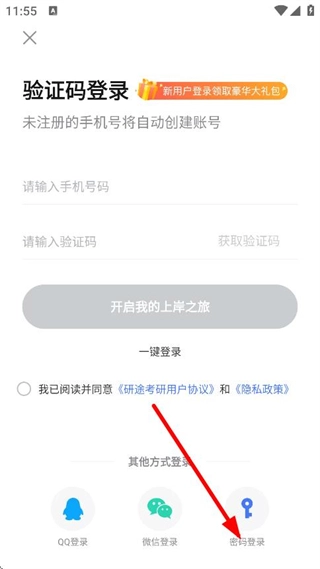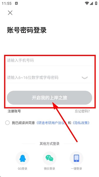 请输入手机号码与密码,点击“开启我的上岸之旅”按钮,即可完成登录流程。