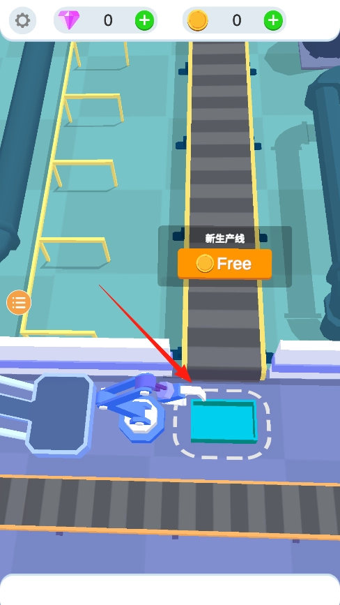 点击那个“Free”按钮就能免费启动第一条生产线,传送带随即开始输送产品。请注意观察蓝色机械臂的作业范围,只有将产品精准放置在虚线框内,才算有效生产。刚开始操作时,建议多尝试几次,以便找准合适的放置位置。