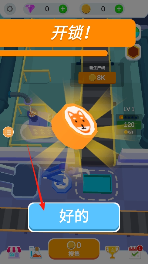 攒够8000金币就能解锁这条带有狐狸标志糖果的新产线,点击“好的”按钮确认后即可投入使用。新产线每小时能多产出6个产品,升级到LV2后效率还会进一步提升,记得常回来查看生产进度哦。