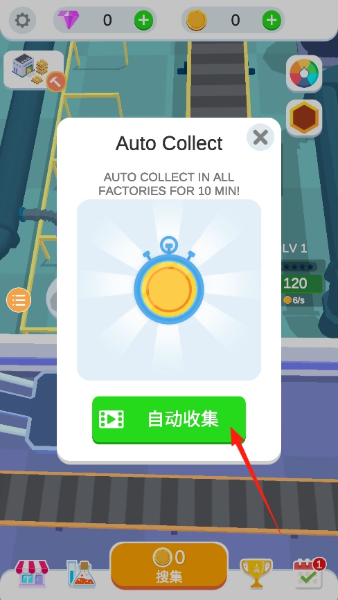 开启自动收集功能后,接下来的10分钟无需手动操作,系统会自动完成所有工厂产品的收集,挂机时用这个功能再合适不过了,但要留意左上角的资源数量,别让它超出存储上限。