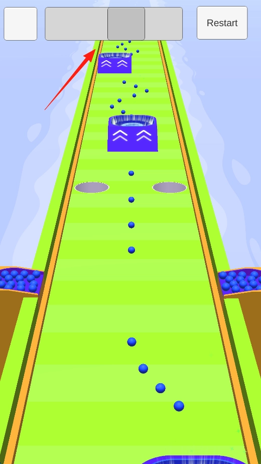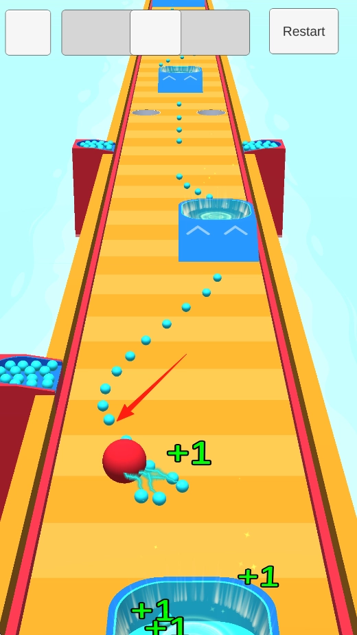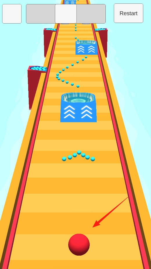 进入新轨道场景后,操控红色大球撞击蓝色小球以改变其运动路径。轨道上设有黄色条纹和蓝色容器,目标是通过撞击使蓝色小球落入容器。在此过程中,可体验红色大球对蓝色小球轨迹的影响,感受互动操作带来的乐趣。