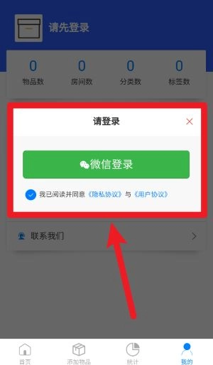 首次使用该应用时,需点击微信登录按钮,并勾选同意《隐私协议》和《用户协议》,才能继续使用应用功能。