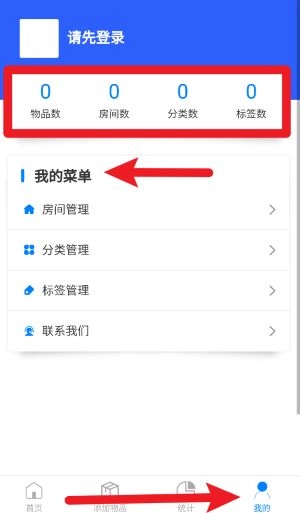 点击底部“我的”菜单,即可查看当前物品数量、房间数量、分类数量以及标签数量等数据概览,同时还能找到对应的管理入口。