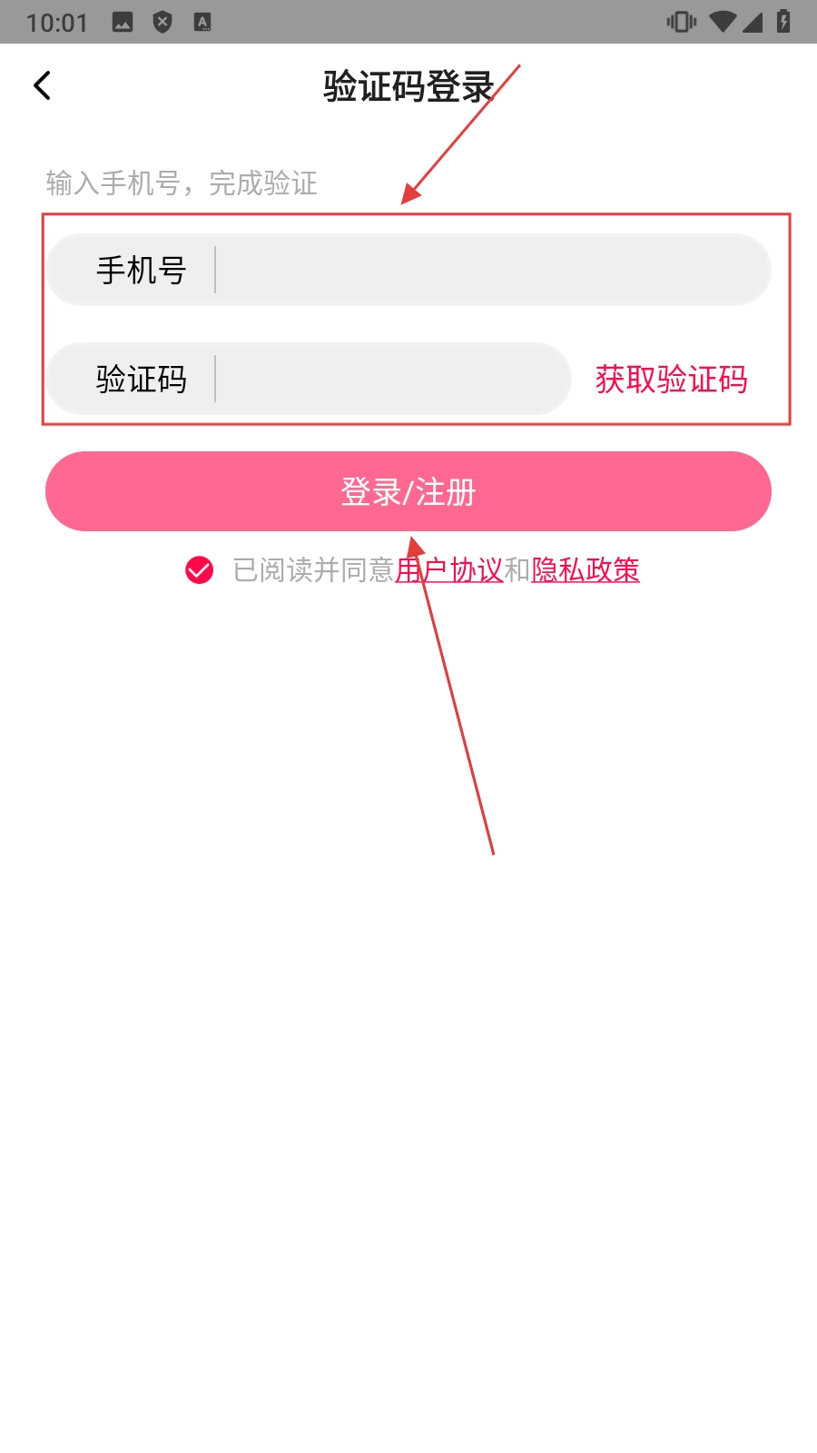 在页面里,输入【手机号与验证码】后点击【登录/注册】按钮,就能完成登录流程。