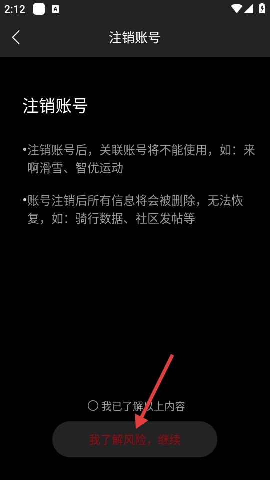在账号注销页面,勾选“我已了解以上内容”选项,接着点击【我了解风险,继续】按钮,即可完成账号注销流程。